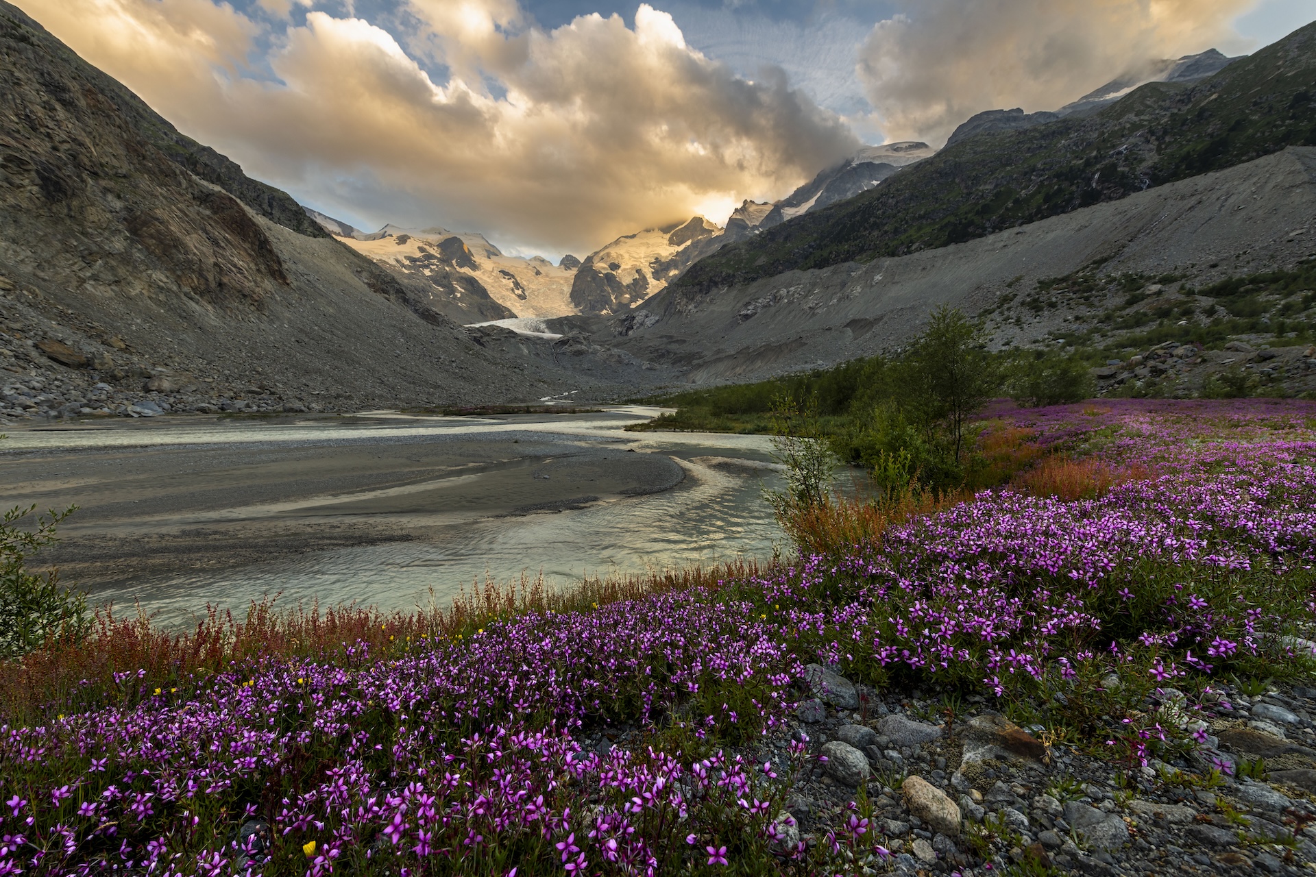 Blühendes Gletschervorfeld - Weidenröschen an der Lonza vor dem Bietschhorn im Lötschental