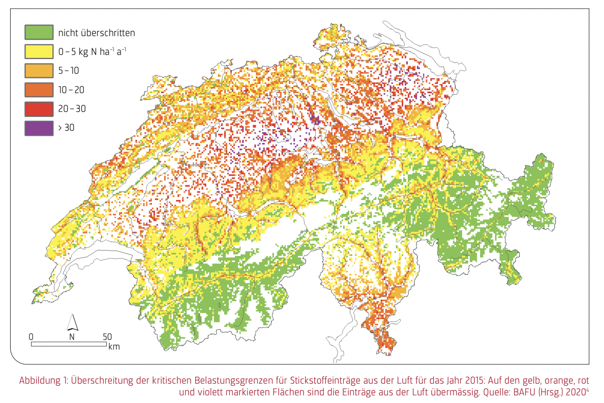 Die Wissenschaft hat planetare Grenzen identifiziert, innerhalb derer die Bedingungen für menschliches Leben stabil bleiben. Werden sie überschritten, sind die Lebensgrundlagen der Menschheit gefährdet. Die planetaren Grenzen sind hinsichtlich Biodiversitätsverlust, Stickstoff- und Phosphorkreislauf bereits deutlich überschritten. Zudem sind in weiten Teilen der Schweiz kritische Belastungsgrenzen der Stickstoffeinträge aus der Luft überschritten (critical loads, d.h. Eintragsmengen, unterhalb derer nach dem Stand des Wissens keine schädlichen Auswirkungen auf die Umwelt auftreten). Nährstoffüberschüsse haben stark negative Auswirkungen auf die Biodiversität, die Qualität von Gewässern, Trinkwasser, Böden und der Luft sowie auf die Waldfunktionen, das Klima und die menschliche Gesundheit.