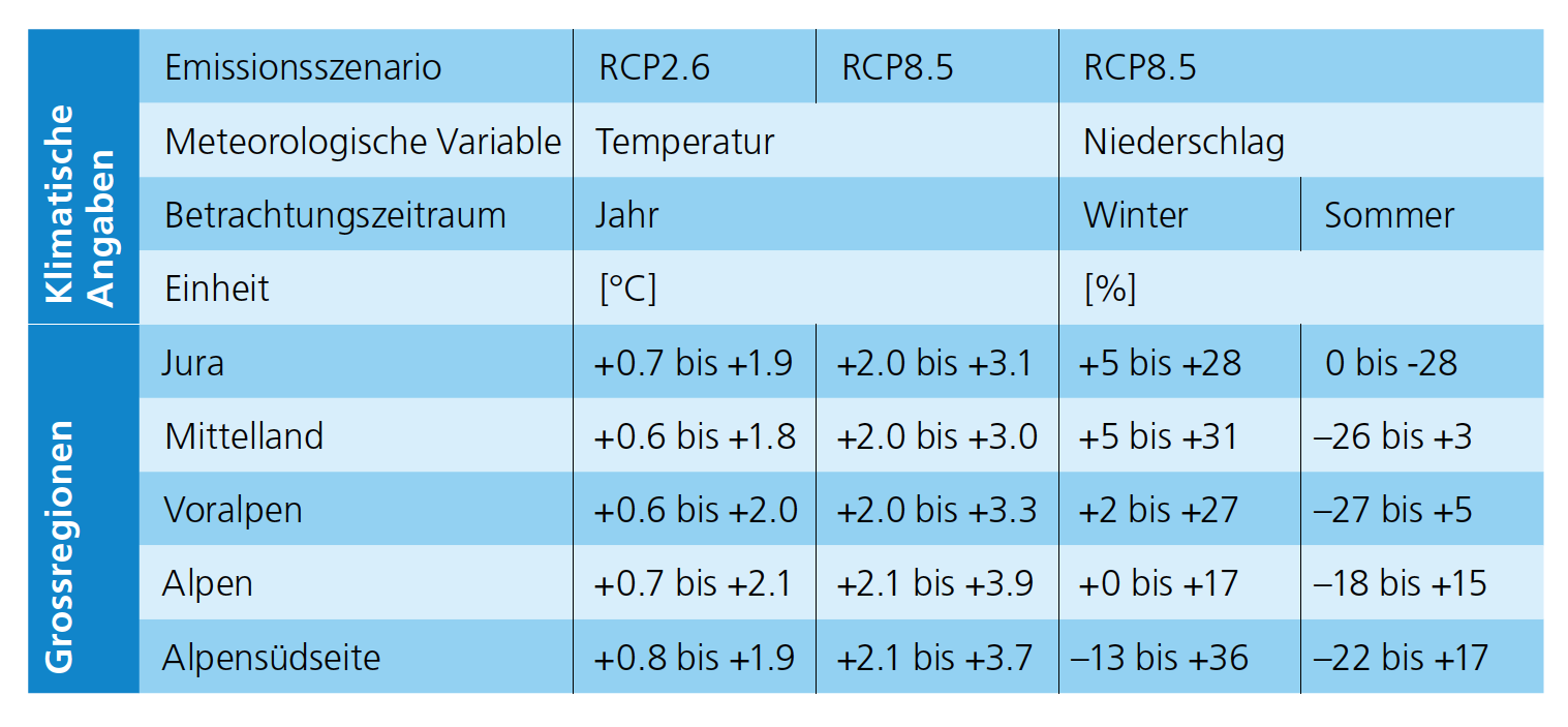 Prognosen zum Klimawandel in der Schweiz, basierend auf Simulationen vom National Centre for Climate Services (NCSS), zeigen, dass in den kommenden Jahrzehnten erhebliche Veränderungen bei Temperatur, Niederschlag und extremen Wetterereignissen auftreten (CH2018, 2018). Diese Veränderungen werden je nach Region unterschiedlich ausfallen, wobei die Veränderungen stark davon abhängen, wie sich die Menge der Treibhausgase in der Atmosphäre entwickelt (Feigenwinter et al. 2018). Die hier vorgestellten Prognosen basieren auf zwei Emissionsszenarien für die fünf Grossregionen der Schweiz bis Mitte dieses Jahrhunderts (Abb. 1). Das Emissionsszenario RCP8.5 zeigt die Auswirkungen des ungebremsten Anstieges der Treibhausgasemissionen, wohingegen eine starke globale Reduktion der Treibhausgasemissionen im Emissionsszenario RCP2.6 angenommen wird.